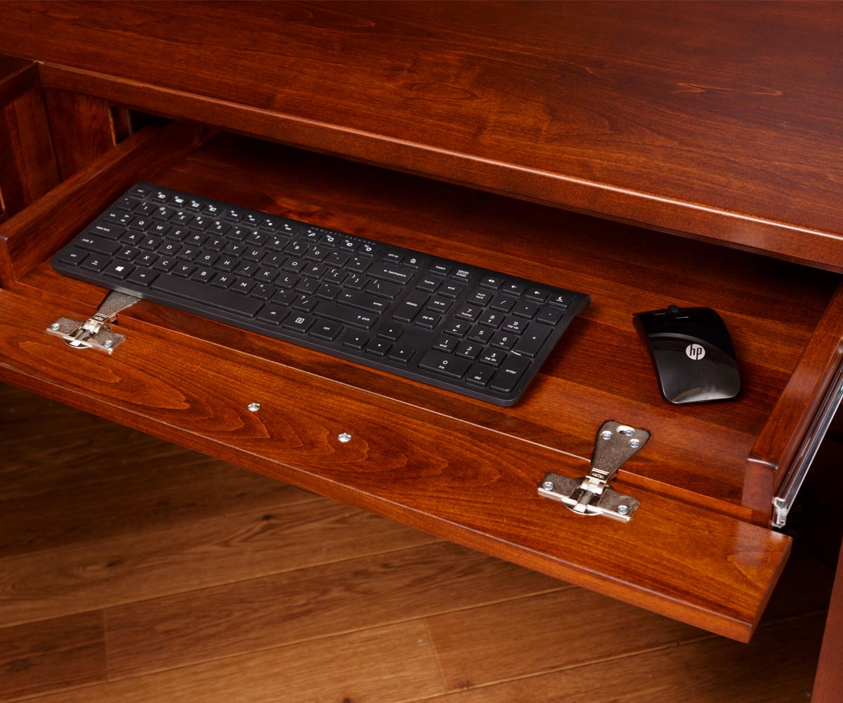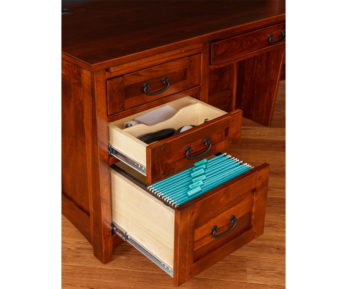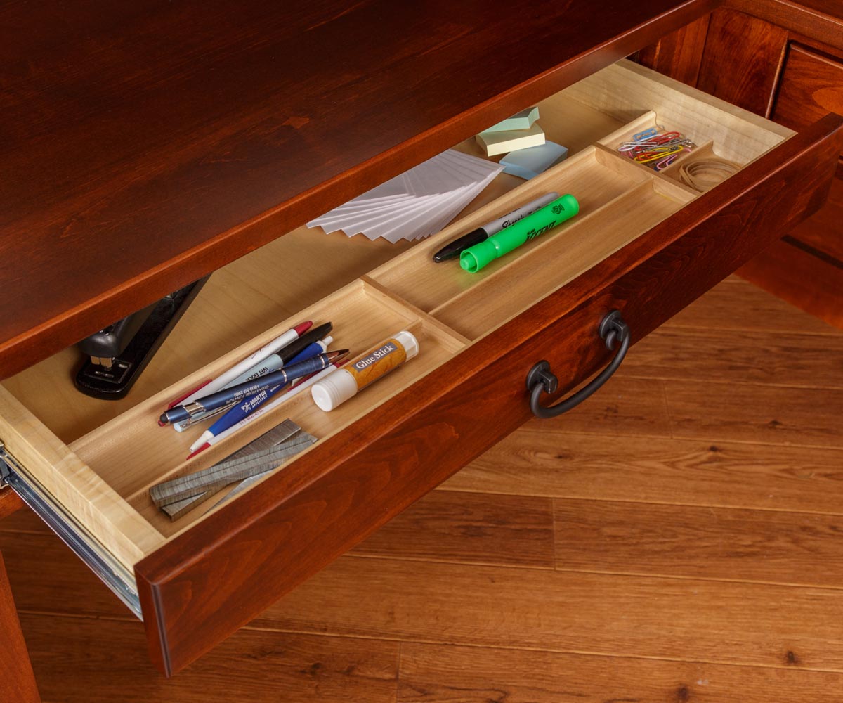 • Writing tray pullouts above each drawer stack